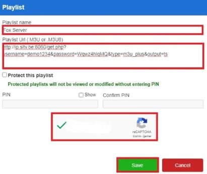 5. Saisissez votre “ID de périphérique” et “Clé de périphérique” dans les champs correspondants. Cochez la case “Je ne suis pas un robot” et cliquez sur “Gérer les listes de lecture”.