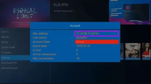 Lancer l’application : Une fois installée, ouvrez Flix IPTV pour afficher l’adresse MAC de votre appareil.